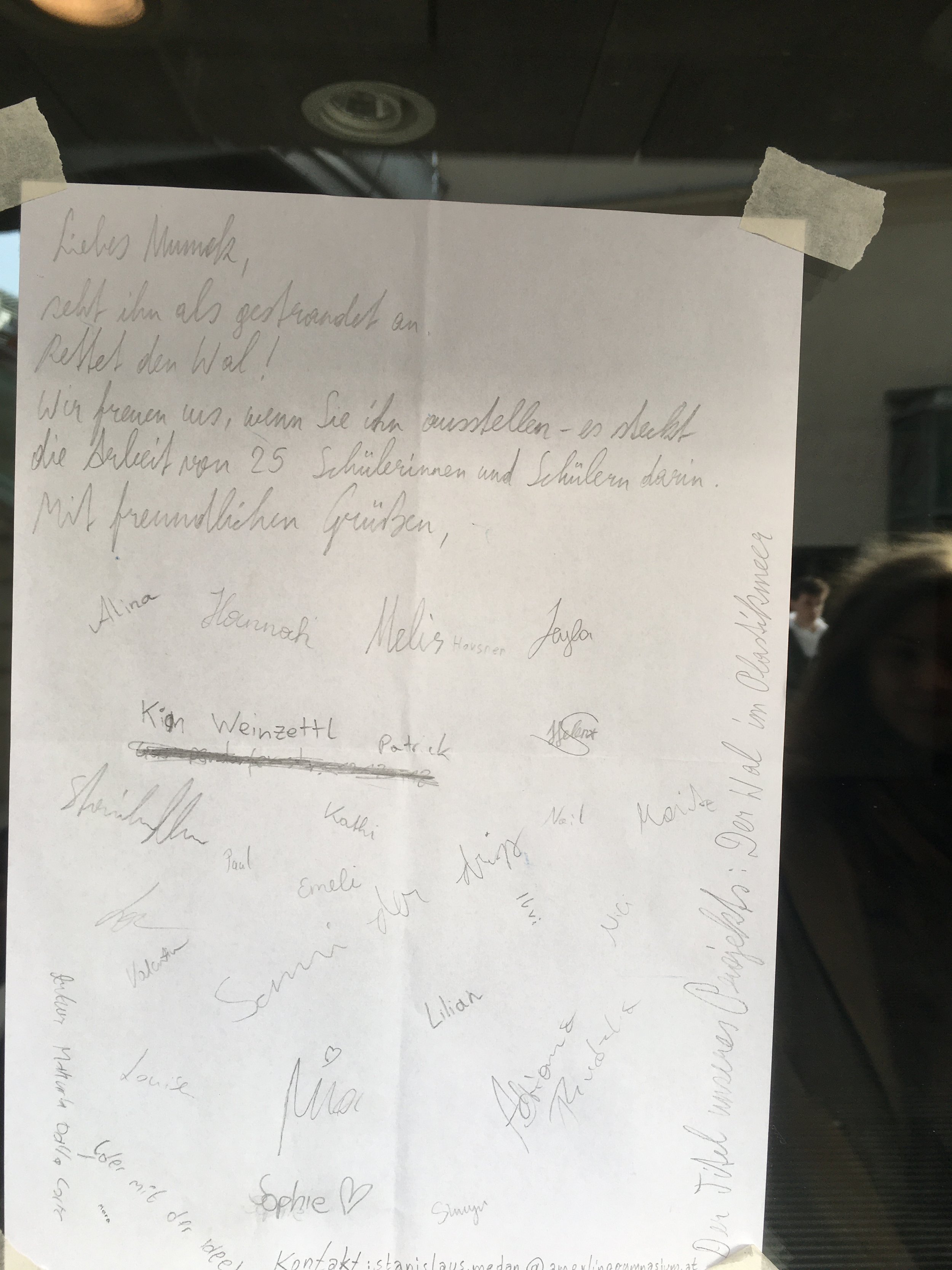 Eine Stunde später ging ich mit einer anderen Klasse anlässlich eines normalen Lehrausgangs zum Mumok, und zu diesem Zeitpunkt war vom Wal keine Spur mehr. War er untergetaucht? Im Lauf des Tages reagierte das Mumok mit einem Instagram-Post, in welchem die Chefin, Karola Kraus, mit dem Wal posiert: